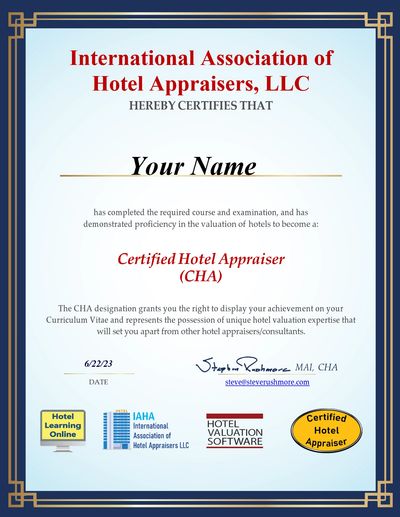 To distinguish between an ordinary appraiser and a hotel appraiser Steve Rushmore, MAI, the creator of the Hotel Valuation Methodology has developed a certification program that focuses on the business aspects of a hotel valuation. Through Steve's online course, "How to Value a Hotel" experienced appraisers looking to specialize in valuing hotels and new valuers starting their careers can become a Certified Hotel Appraiser (CHA) or Certified Hotel Valuer (CHV).